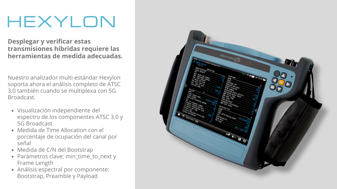 En Gsertel hemos realizado los desarrollos necesarios para hacerlo posible. Nuestro analizador multi-estándar Hexylon soporta ahora el análisis completo de ATSC 3.0 también cuando se multiplexa con 5G Broadcast — gracias al nuevo modo Time-Mux, diseñado específicamente para este tipo de transmisión.