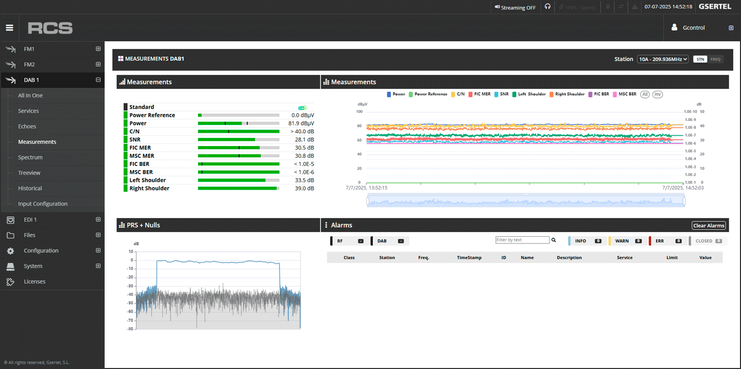 Gracias a su arquitectura configurable, el usuario puede definir en todo momento el número de entradas FM y DAB a monitorizar, adaptando el equipo a las necesidades específicas de la red en cada momento. Esta flexibilidad convierte a RCS Radio en la herramienta ideal para entornos donde se está realizando un despliegue progresivo de DAB, manteniendo el control total sobre las redes FM.